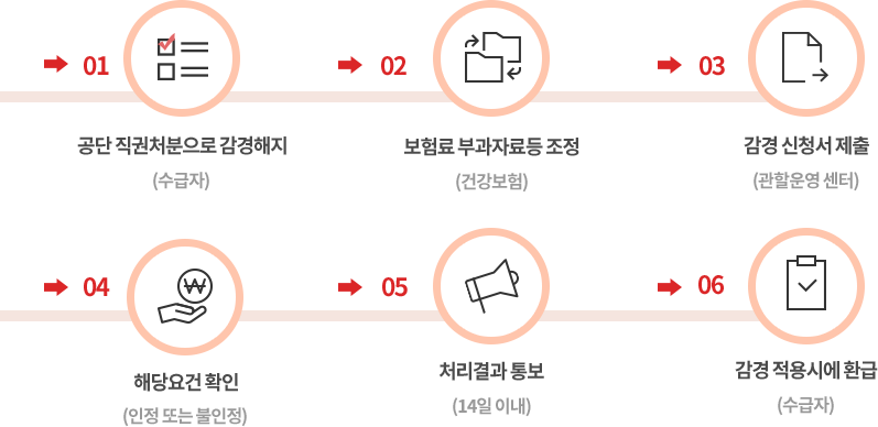 - 국민건강보험공단이 보유하고 있는 자료를 토대로 해당요건 확인하여 직권으로 감경 적용